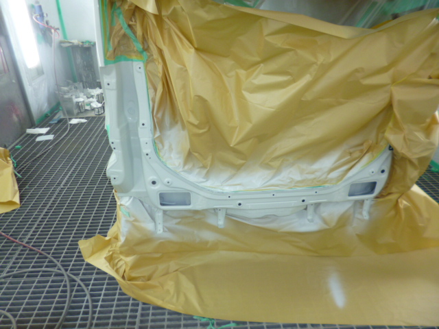 リヤバンパー取替、左右リヤバンパサイドサポート取替、バックドアパネル取替、バックドアガラス脱着、バックドアロックASSY取替、リヤフロアパン修理、左右リヤフロアサイドメンバー修理、クォータパネル修理など、リヤまわりを中心とした広範囲の修復を行いました。