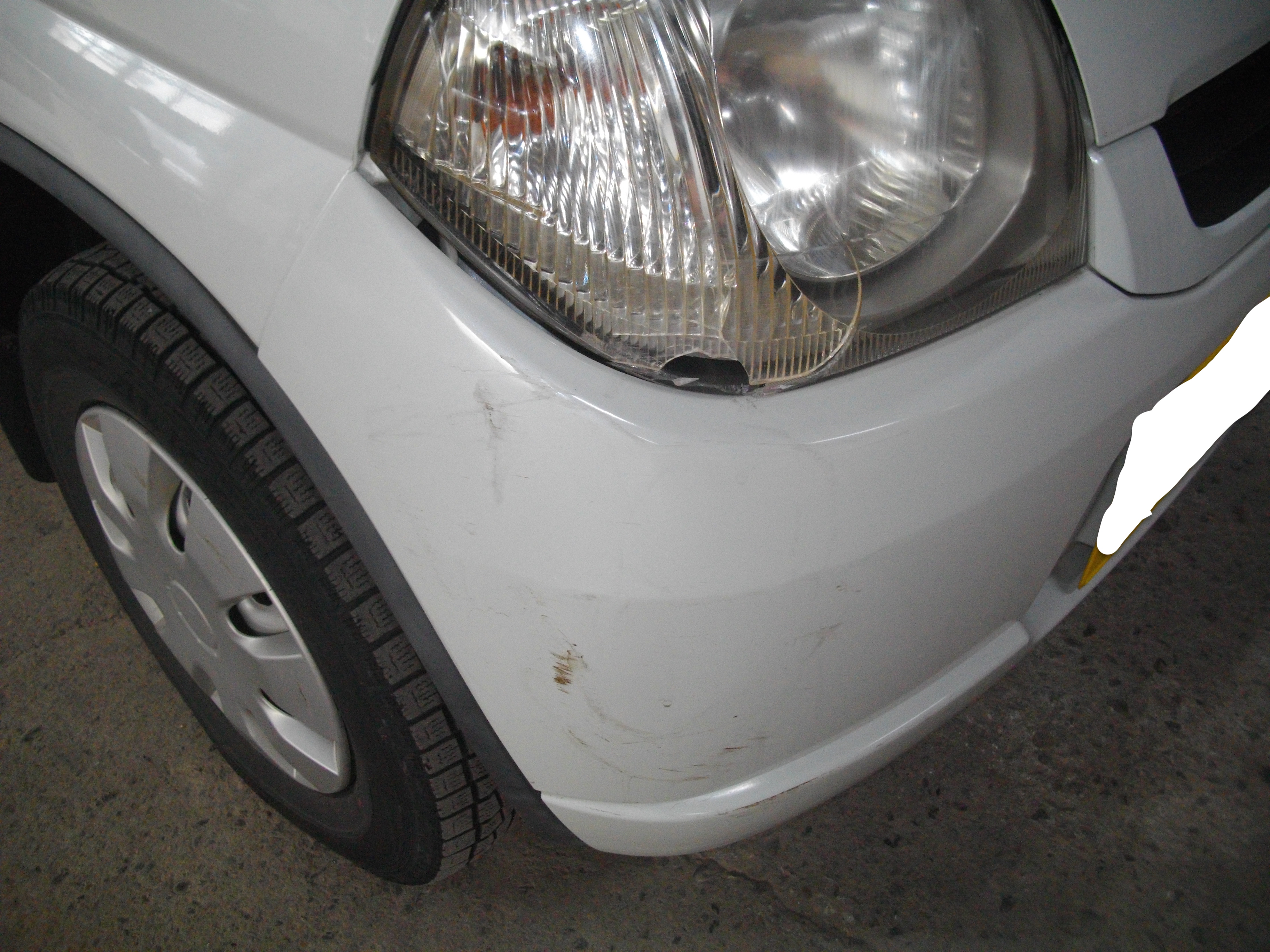 スズキKeiの右フロントフェンダーとバンパーのへこみ修理を実施。板金修理と高品質2K塗装で低コストかつ美しく復元。
